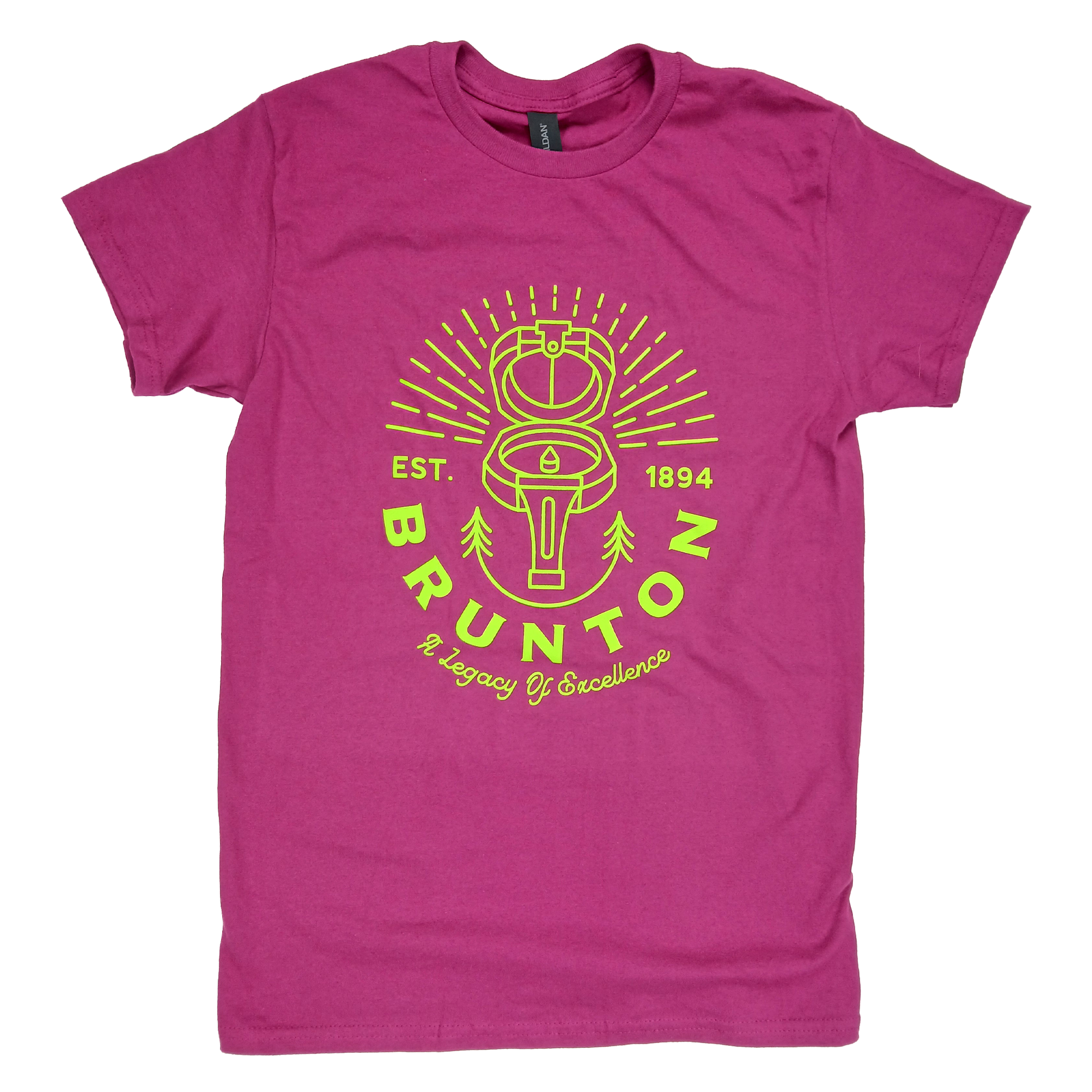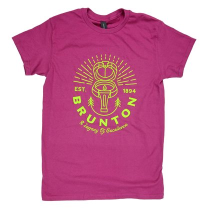This tee features another graphic from Russell Cosgrove at Rocks & Wood Co. in Idaho, printed in bright lime/yellow on a bold raspberry shirt.  100% cotton with a lightweight feel.  Print is only on front - back of shirt is blank...unless you wear it backwards.