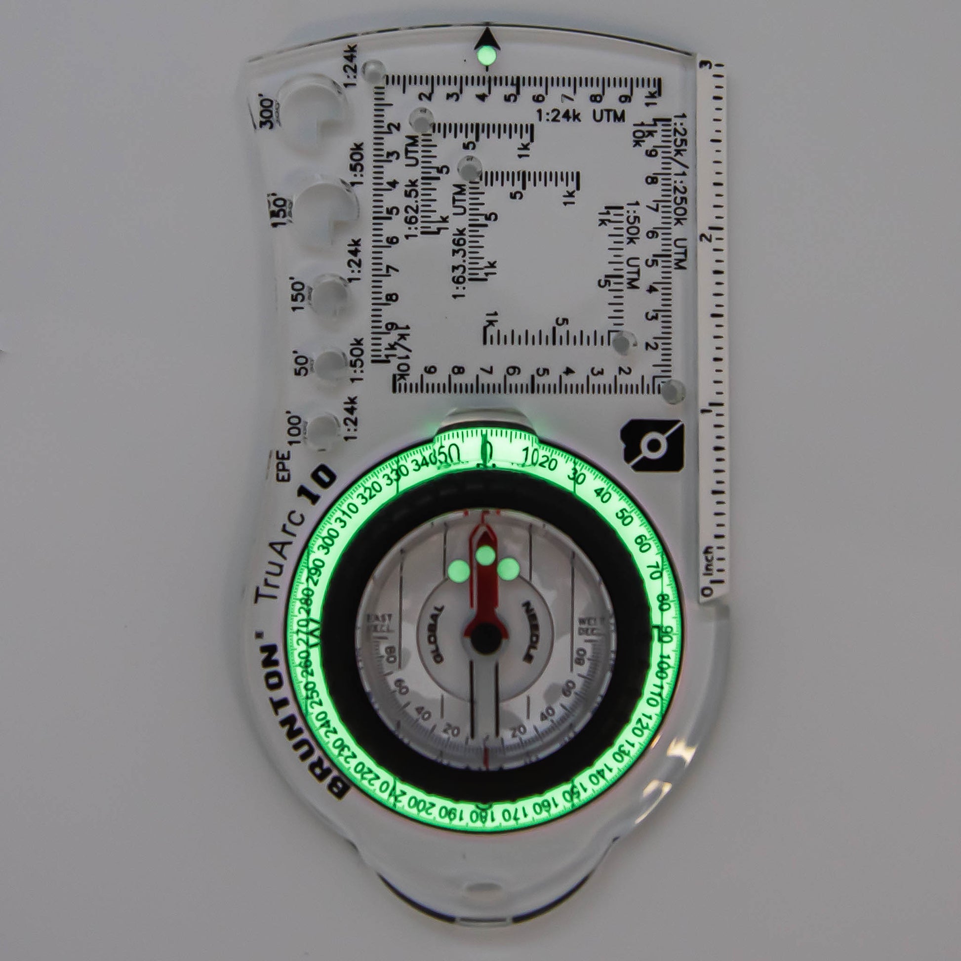 • Travel a bearing well after dark, the luminous azimuth ring, magnetic needle, direction of travel arrow and sight will glow brightly for up to 8 hours.